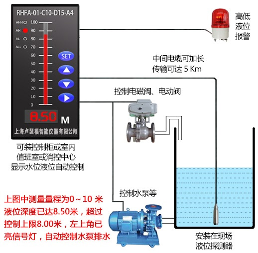 室等易于观察的地方进行远距离的监控。可以实现水位液位监控显示、满液位满水位报警、高液位高高水位报警、低液位低水位报警、恒液位恒